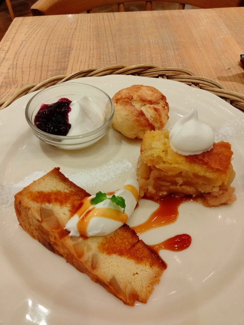 お好みのスイーツ3品とお好みのお茶を選べ、私は スコーン、アップルパイ、何かのケーキ(忘れた!)に、紅茶はダージリンにしました。