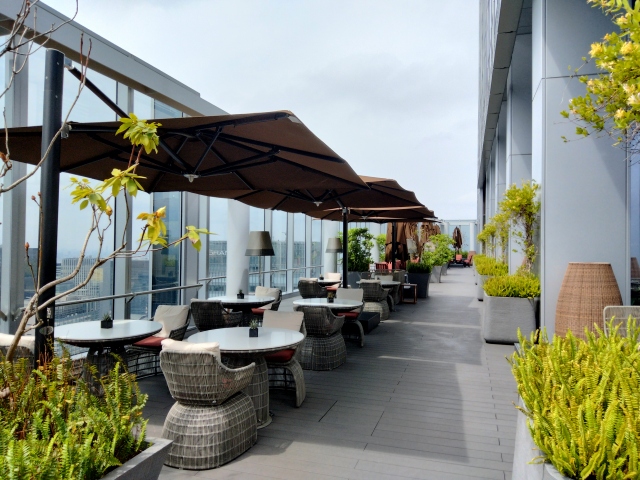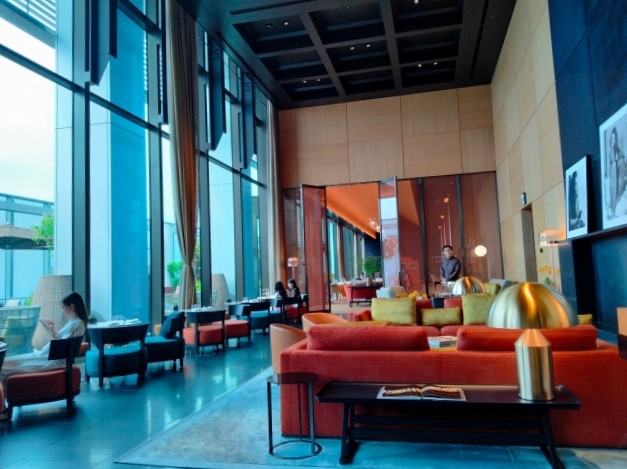 上層階のロビーはあまり広くないけれど、大きな窓とテラスで明るく開放的な雰囲気です。アマン東京より好き。