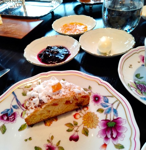 ただ唯一の致命傷が、アフタヌーンティーにとって非常に大事なスコーンが、変化球すぎてよろしくない! なんかでっかくて砂糖がいっぱい乗ったドライフルーツのケーキみたいなのが、2人に1個出てきて、半分こするのよ。
