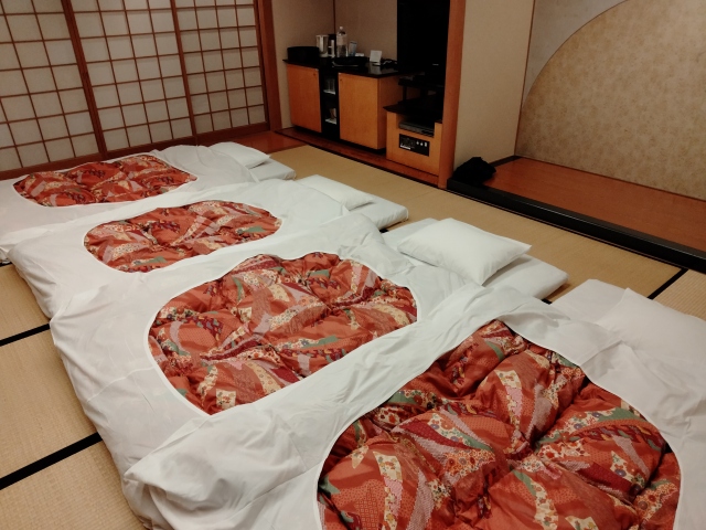 夕食後に部屋に戻ったら、布団が敷かれていたのだけど、4人だから「田の字」に敷かれているだろうなぁと皆さん思っていたら、なんと4人横並びでした! なんだか修学旅行みたいな感じだなぁと皆で笑いました。