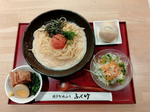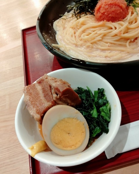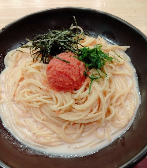 お昼の一番人気は、かねふくの明太子がドン!と乗った、「めんたい丼御膳」らしいけれど、私は 「たっぷりすぎ明太子パスタ」 にしました。注文は自分のスマホで。こういうお店最近すごく多くなってきたね。