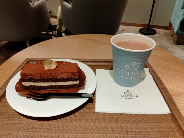 ティラミスケーキと、ホットココアを飲みました。やっぱりゴディバのココアは旨いね!