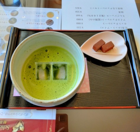 喫茶コーナーもあり、生チョコレートと抹茶が組み合わせの面白いセット\825 があり注文。