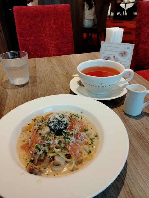 生ハムとポルチーニのパスタも頼みました。すごく美味しい! パスタに付いてくる紅茶は、ノンカフェインでベリー系の香りがする『カトル フリュイ ルージュ ルイボス』でこちらも美味しかったです。
