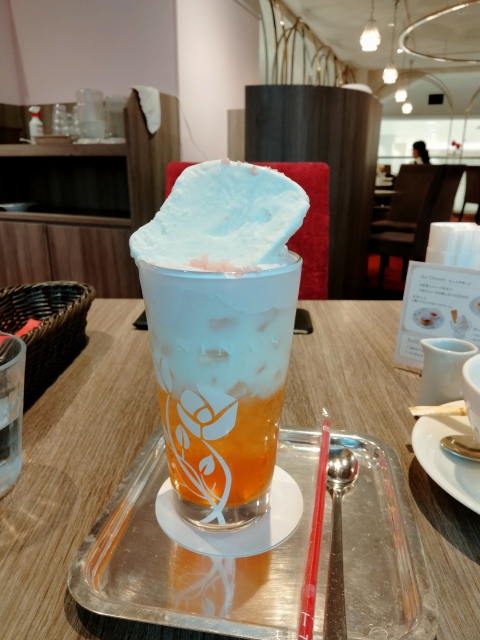 『エテ・スパーク・ココ』 冷房効いていないから上のアイスが暑くて溶けかかっとりますが、ライチとローズのシロップとロイヤルミルクティーの2層の紅茶に、ココナッツアイスとポッピングキャンディーがトッピングされていて美味しかったです!
