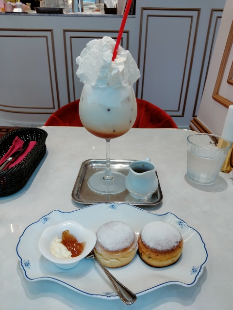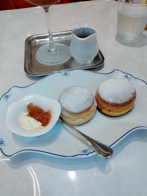 スコーン本体は温かく提供されサックリとして美味しかったのですが、上にかかっている粉砂糖が、スコーンを割る時に指がムダに汚れるし、テーブルに落ちてムダに汚れるし、食べる時に口の周りがムダに汚れるし、ムダに甘い味がつくし。粉砂糖は不要だと思いました。