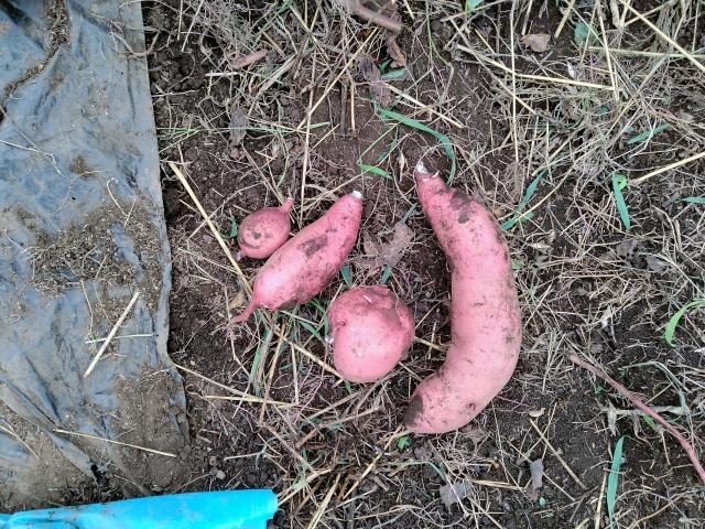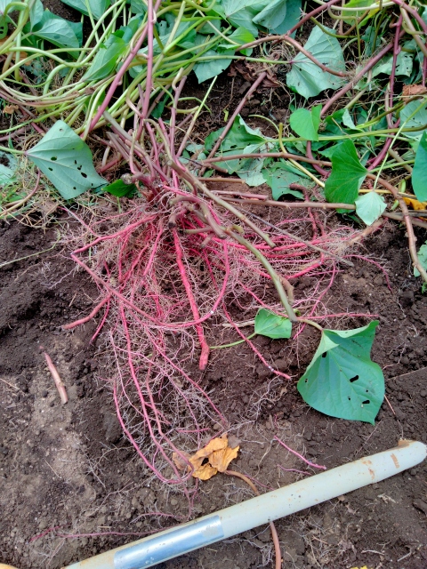 もう1株は根っこばっかりで芋はできていませんでした。前からここの土壌はサツマイモは出来ないと地主さんから言われていたのだけど、やっぱりそうなんだな。