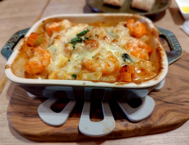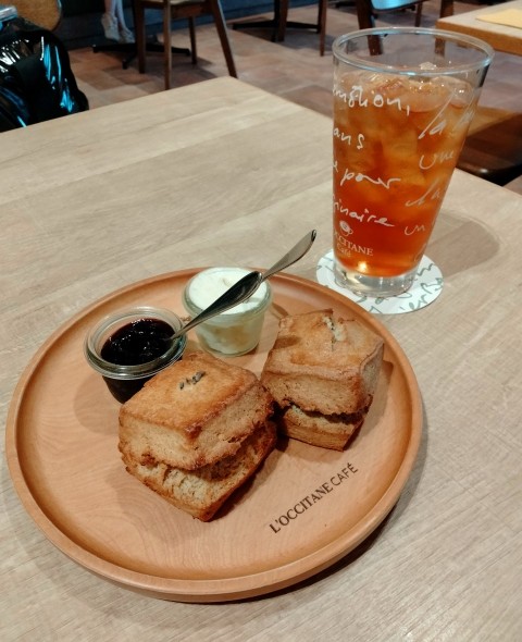 ロクシタンのアイスティーが体に染み染みしておいしい。エビのチーズグラタンと、そば粉のスコーンを頼みました。