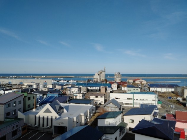 部屋からの眺望は、オホーツク海。静かな港町の光景です。