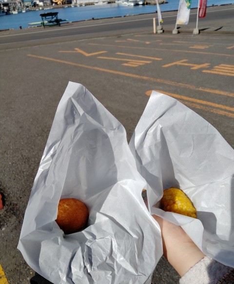 私はカニマヨ揚げ、友人はとうもろこしのかまぼこ。