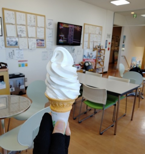 それから出塚水産では、2階をイートインスペースとして開放しており、ここでも揚げてもらったかまぼこや、よつ葉乳業のソフトクリームを食べる事ができます。