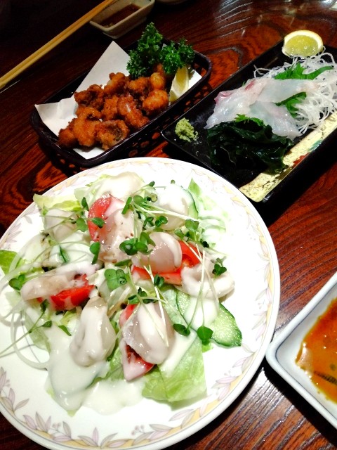 ホタテサラダ、タコの唐揚げ、ソイの刺身に黒いのはワカメ。