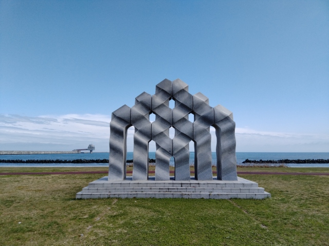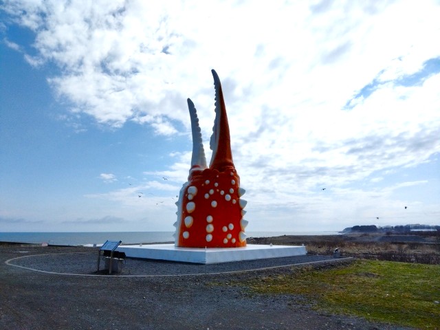 オホーツク海を眺めながら護岸を歩き、カニの爪オブジェへ。