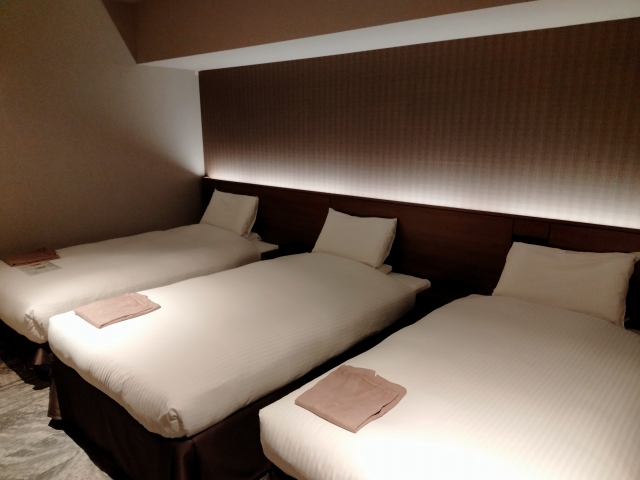 お部屋は真ん中に洗面台があるというちょっとくせのある面白い間取りだったのですけれど、スタンダードのお部屋でもベッド3台置いて広い!(もしかしたらアップグレードしてくれたのかも?)