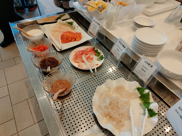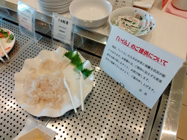 ただ! 非常に残念でしたが、朝食ビュッフェの一番のお目当てだった、食べ放題の刺身コーナーが、不漁との事で、イクラとホタテが無かったのですね。泣