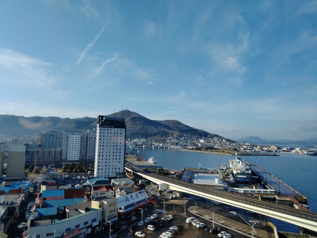 休憩スペースからの景色も素晴らしい。今回は行かなかった函館山です。