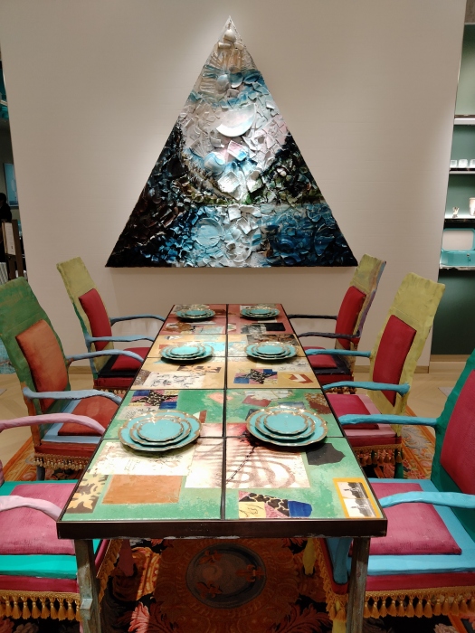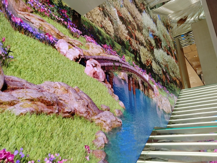 帰りは階段で、巨大なデジタル壁画を見ながら下りました。映っていませんが、キラキラの宝石を纏った小鳥が飛び回っています。